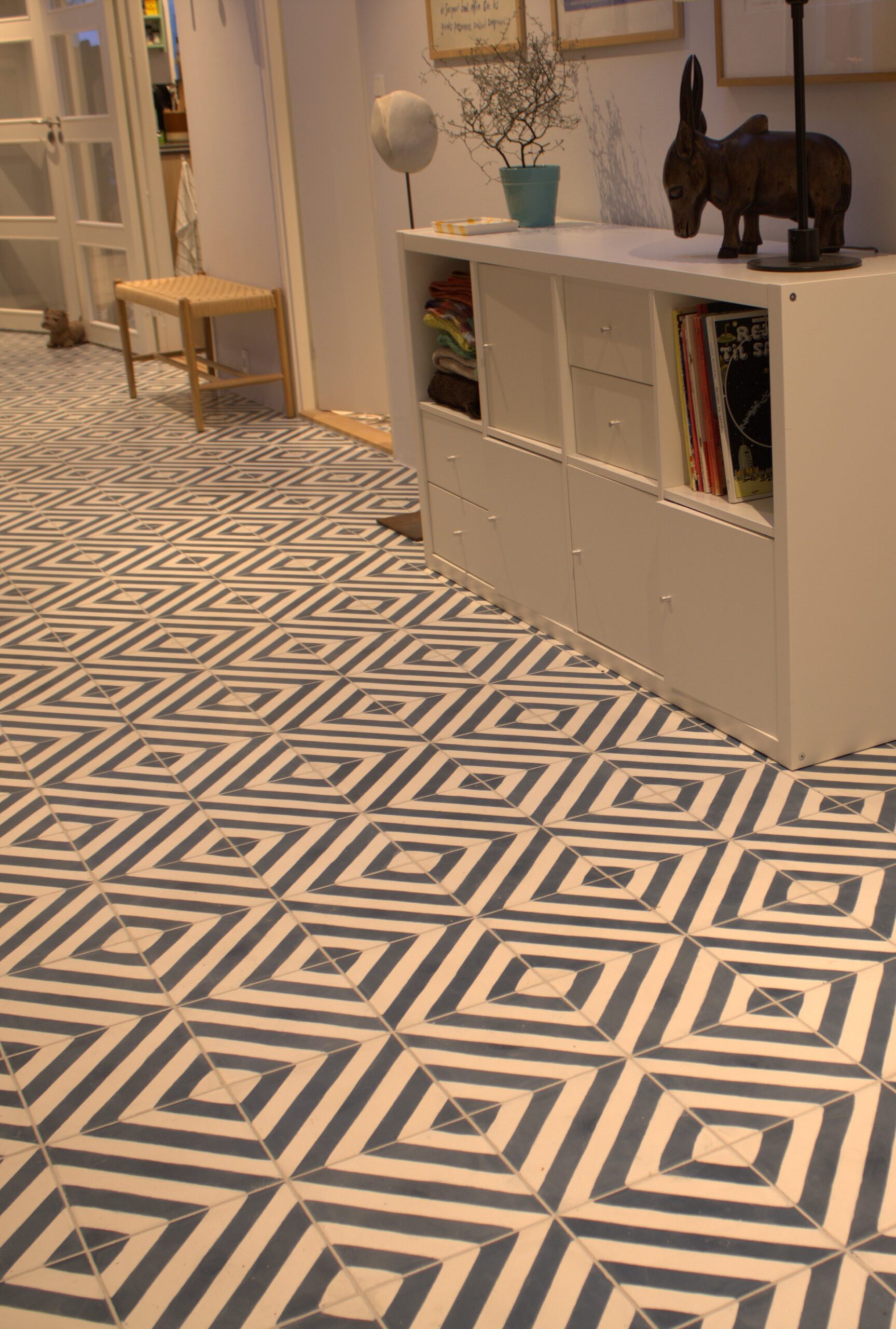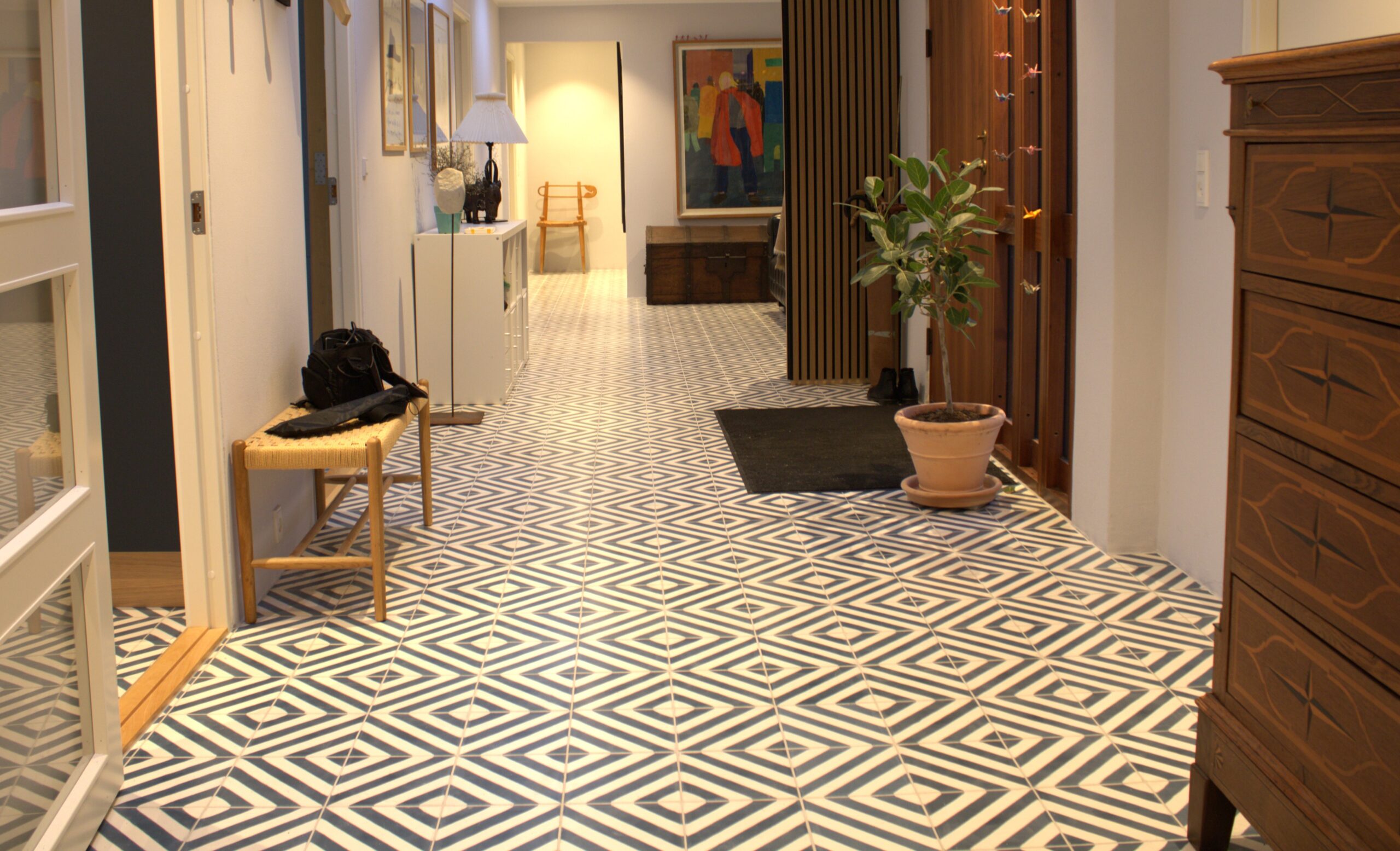 Stil: Moderne geometrisk mønster. Det fulde mønster dannes ved at kombinere fire fliser.