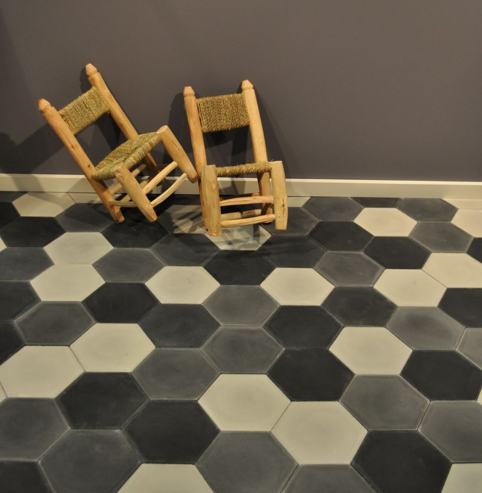 Opgrader din bolig med udsøgte håndlavede cementfliser, designet ved hjælp af en tolagsteknik med et holdbart marmor slidlag. Hver sekskantede flise måler 20 x 22 cm og giver et tidløst præg til dit rum.