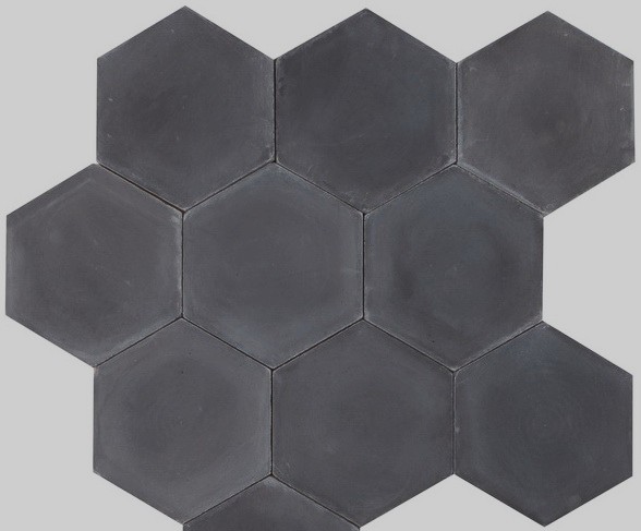 Denne håndlavede cementflise fås i alle 30 farver. Desuden fås den i andre størrelser af heksagon formen – samt i andre former.